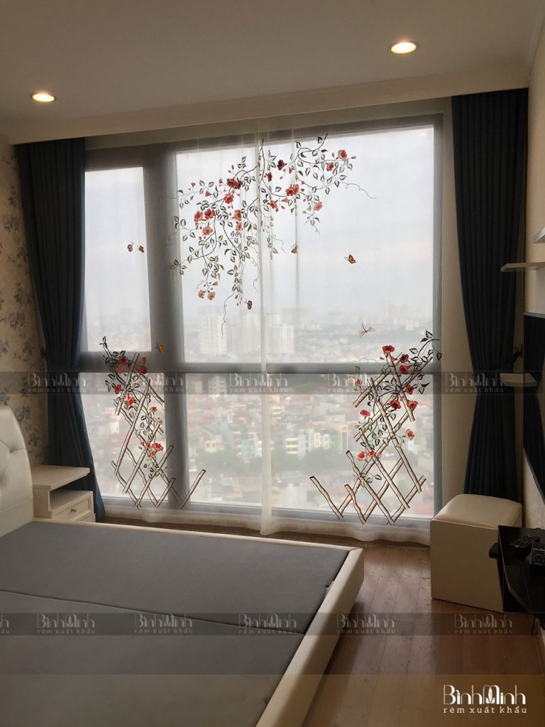 Rèm Bình Minh thi công mẫu rèm thêu hoa đăng tiêu cho khách hàng tại căn hộ chung cư Linh Đàm. Team Rèm Bình Minh đã thiết kế lại một vài chi tiết để mẫu rèm phù hợp với kích thước cửa cũng như nội thất trong căn phòng.