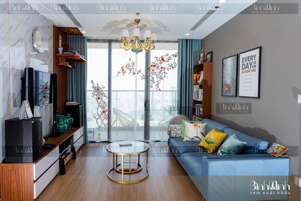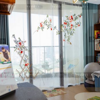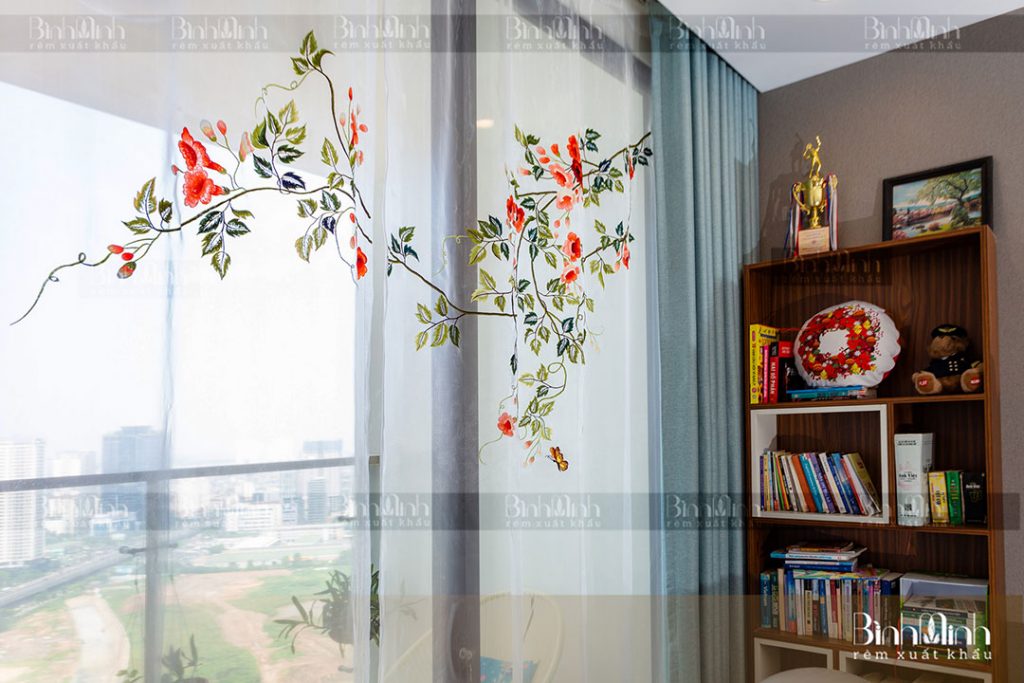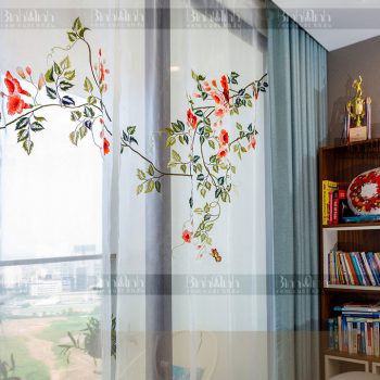 Mẫu rèm vải 2 lớp cao cấp với lớp vải ngoài nhập khẩu sang trọng, kết hợp với lớp voan bên trong thêu hoa đăng tiêu đã tạo nên điểm nhấn nổi bật cho không gian căn hộ.